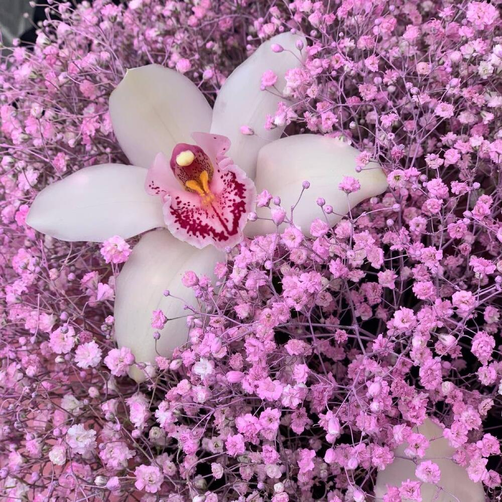 Гипсофила - 10 шт.Орхидея Цимбидиум - 3 шт.Коробка шляпная - 1 шт.Оазис флористический - 2 шт.Пленка матовая - 1 шт.Тишью - 3 шт.Лента атласная - 4 шт.